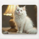 A fluffy white house cat with bright eyes sits gracefully next to a warm, glowing lamp