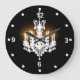 You can have a chandelier in any room of the house with this fun black and white clock. A black background with white numbers and dots and white graphics of a ornate looking chandelier that appears to be lit. Customize to add any text you want. Fun clock that makes a cool gift idea.