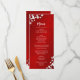 White cherry blossoms on a shimmering red background. With custom bride and groom names, the wedding date and a custom menu text.