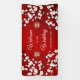 Chinese wedding banner with pretty white cherry blossoms and two gold double happiness signs on a shimmering red background.