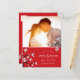An asian / japanese themed, original illustration of modern and elegant white cherry blossoms spring flowers with black branches on a red background over one photo, save the date postcard design.