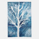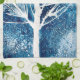 Winter theme blue and white watercolor painting of a white birch tree with snow background. Arty original artwork with a Christmas theme. Blue and white Christmas.