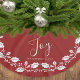 Add this festive tree skirt to the bottom of your Christmas tree. The background is a dark rich red with a border of white holly leaves and the word "Joy" in hand written style text. Custom text allows you to personalize with a name.