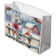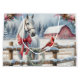 Christmas gift bag with a pretty white horse, a pretty red cardinal on the fence and a rustic barn in the background of a snowy winter day done watercolor ai art.
