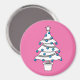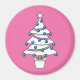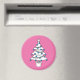 An illustration of an elegant chic white Christmas tree with plenty of blue hanging balls in pink background. This design is for people who loves Christmas, giving gifts and giveaways.