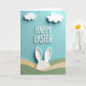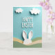 This card features raised white lettering that reads “HAPPY EASTER” across the upper middle, with soft shadows that make the words stand out against a sky-blue background. Two puffy white clouds drift above the greeting, echoing the same bright white tones and giving the scene an airy look. Below the text, layered hills in muted green and creamy beige roll gently across the lower half, like a quiet spring meadow 🌷. From behind the hill layers, a pair of long white bunny ears peeks up, suggesting a shy little rabbit watching from a safe spot 🐰. The ears have faint inner shading, adding a tender, bashful touch as if the hidden bunny is listening for a friendly call. The lighting stays soft and even, giving the clouds, letters, and hills a smooth, rounded depth without harsh edges. The words “HAPPY EASTER” sit centered above two cloud shapes, while the white ears rise from the middle of the green-and-beige layers.