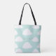 Cute and whimsical all over print tote bag featured white clouds on aqua blue background. This tote bag can be personalized, perfect as a baby shower favor bags or as a gift.