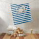 Bright blue and white horizontal stripe swaddle baby blanket with a nautical ocean theme featuring a white crab!