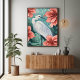 A white egret stands gracefully amidst a vibrant tropical backdrop. Its plumage is a stark contrast to the lush green foliage and the large, coral-colored hibiscus flowers that frame the bird. The egret's long, slender legs and elegant neck are highlighted against the teal-green background, creating a sense of tranquility and serenity.