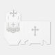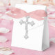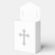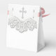 Elegant pearl white cross first communion, baptism and christening favor boxes. This beautiful white cross first communion favor box can be customized with text and the background and bow color of your choice.