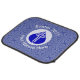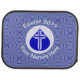 White Christian cross in a dark blue teardrop. Shows on a fractal of a white squiggly square circle on a blue squiggly square background. Reads EASTER and a place to customize the year. Car mats can be personalized for any occasion or holiday.