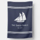 This midnight blue and white nautical welcome flag has a white sailboat in the center. Below the sailboat, there's text that you can change, delete, or leave as is (shown: The Smith Family Est. 20xx). You can include a custom message or your family's name and year established. The text can be edited or deleted. The text is white. The flag is midnight blue.