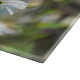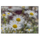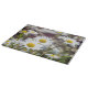 A beautiful photograph of white daisies printed on a glass chopping board.