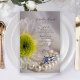 Customize the elegant White Daisy and Diamond Ring Wedding Menu with the details of the meal that you will serve at your bridal shower luncheon, engagement garden party or marriage reception dinner by adding the salad or first course, entree or second course and dessert or third course. This classy custom flowery wedding menu features a floral photograph of a white daisy flower blossom with a round diamond engagement ring and pearl necklace.