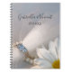 Personalize the pretty White Daisy Elegance Wedding Spiral Notebook with the personal names of the bride and groom and specific marriage ceremony date to create a guest book, advice book or journal to keep track of your wedding planning notes. This classy custom botanical wedding note book features a digitally enhanced floral photograph of a white daisy flower blossom, white pearl necklace, diamond engagement ring and wedding band set with a light gray background.