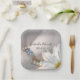The pretty White Daisy Elegance Wedding Paper Disposable Plates can be personalized with the names of the bride and groom and marriage ceremony date. These elegant custom flowery paper plates feature a floral photograph of a white daisy flower blossom, diamond engagement ring and wedding band set and pearl necklace with a light gray background. Suitable for a classy white flowery or daisy engagement party, bridal shower or nuptial theme.
