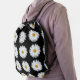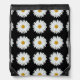 This trendy backpack with drawstrings for school, travel, hiking and more features the photo image of a white Daisy flower on a black background and printed in a repeating pattern. A fun, floral design!