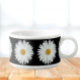 White porcelain chili bowl that doubles as a mug for hot drinks and cereals that features a wrap-around photo image of a pretty, white Daisy flower on a black background and printed in a repeating pattern. A lovely, floral design!