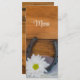 The charming White Daisy and Horseshoe Country Western Wedding Menu can be personalized with the details of the meal that you will serve at your informal yet elegant rural farm or ranch style bridal shower luncheon, post wedding brunch or marriage reception dinner by adding the salad or first course, entree or second course and dessert or third course. This relaxed and rustic custom equine theme wedding menu features a quaint floral photograph of a white daisy flower blossom, rusty horseshoe, pearl necklace and white bridal veil with a brown weathered barn wood background.