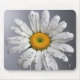Close up of a white daisy with dripping raindrops on a soft gradient gray background