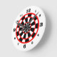 This bold design resembles a dartboard & makes a perfect clock for a game room. The center features concentric red circles with black squares on a white background. Large black numbers on the plain white make it easy to tell the time.