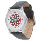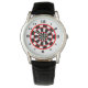 A red and black watch design that resembles a dartboard with a white background designed for game lovers. Large black numbers to mark the hours are on a white background to make it easy to tell the time.