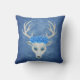 This throw pillow is a misty blue with a white deer head with blue eyes, large antlers and wearing three blue roses on the front and back.