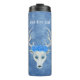 This thermal tumbler bottle to keep your drinks cold or hot is blue with a white deer head with large antlers, a mysterious face and wearing three blue roses on its head. Customize your text with template.
