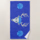 This custom beach towel is a dark vibrant blue with tiny white specks and the head of a white deer with large white antlers wearing blue roses. A blue rose is on each end of the towel also.