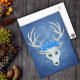 This postcard has a white deer head with antlers and bright blue eyes with three big blue roses on the top of its head on a background of misty shades of blue.