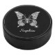 A classy white diamond butterfly design to personalize name in white script text on black background. Click “Customize” to change colors and type styles.