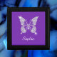 A classy white diamond butterfly with white script name on purple background.
