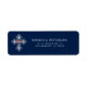 Image of a white diamond cross with a red gemstone accent over a dark-blue background. Custom text in white.