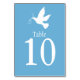 White dove with blue wedding reception dinner table number cards or other dining event table numbers. A great idea to help guests find their seats at your wedding or event. You must change the number to each number that you need and add them each your cart, one at a time. Quantity discounts may apply once you add all the items to your cart. If you have any questions or need help or other wedding items in this style please contact me. Unique design by Sarah Trett.