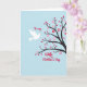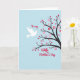 Designed with a calm spring scene, the card shows a dark-branched tree stretching in from the right against a light blue sky. Soft pink and deep magenta blossoms dot the branches, with small red berry-like clusters adding little sparks of warmth. A white dove glides on the left, its tiny dark eye and red beak giving it a gentle, affectionate look, like it’s carrying a quiet “I’m thinking of you” ❤️. The lighting stays even and simple, letting the shapes and colors do the talking without heavy shading. A flowing crimson message sits across the open sky area near the center-left, sized large enough to read at a glance and balanced so it doesn’t cover the dove. Smaller matching text appears nearby to note a family role and the day being honored, tucked neatly so it feels connected to the main line. The final detail is the dove angled upward toward the blossoms, with its wings spread wide beside the tree’s highest flowers 🌼.