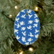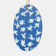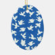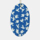 A pretty ornament with white doves on a bright blue background, from a handpainted paper collage design by Judy Adamson.