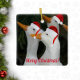 Square, ceramic ornament that features a whimsical photo image of white ducks with orange bills wearing red Santa hat, wishing one a Merry Christmas. Image printed on both sides. A fun, holiday design!