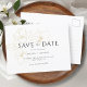 These modern minimalist wedding save the date postcards feature delicate imitation gold floral elements, a contemporarty set of fonts in jet black, against a crisp white background. Flower detail is repeated at the back. This design is contemporary and chic. Perfect for the stylish and elegant couple.