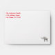 Design features pre-written return address in red. Image of a white elephant is pictured at bottom right corner of envelope front. Inside is a festive red. Perfect for sending out White Elephant Gift-Exchange invitations.