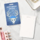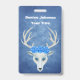 This name or identification badge is a misty mix of blue shades with a white fantasy deer head with large antlers and three pretty blue roses on top of its head. Customize your name and information with the templates.