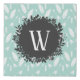 A light blue background with a beautiful pattern of feathers and arrows. The feathers are two and two next to each other, pointing different ways, and the arrows are under the faethers , pointing at the same direction as the feather above them. There are also modern looking triangles pointing down. In the middle of the design there is a dark gray circle with silhouettes of leaves around it. In the gray circle you can write your monogram.
