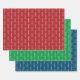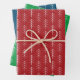 Minimalist Holiday wrapping paper flat sheets with a white fir tree pattern . One is red , one is green and one is blue .