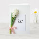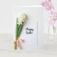 Designed with a bright white backdrop, this flat-lay scene feels airy and close, like a quiet note left for someone you care about 🌷. On the left sits a dense cluster of small white blossoms, each petal curling around a tiny yellow center, suggesting early spring. Thick green stems and glossy leaves add rich contrast, and a pale pink satin ribbon is tied into a gentle bow near the base. To the right, a crisp white card rests in the open space, angled slightly toward the flowers as if set there with care. The greeting text is placed near the center of the card in flowing black lettering, standing out clearly against the white. Soft, diffused light smooths the shadows and highlights the sheen on the ribbon, giving the arrangement a tender, almost romantic calm 🐇. The card sits beside the bouquet with ample white space around it, and the bow’s loose loops fall toward the lower edge of the frame.