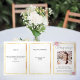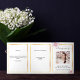 An elegant tri-fold program. A white background, a faux gold frame, pink and white florals and space for a photo. Personalize and add name, dates and your text.