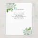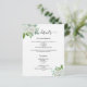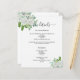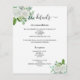 A modern, elegant wedding details/program/timeline. A white background, decorated with white watercolored florals and eucalyptus greenery. Personalize and add your names and wedding details. Black colored letters.