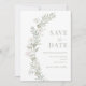 Indulge in sophistication with our refined rustic Save the Date invitations, featuring a delicate whimsical wreath of dusty green leaves intertwined with white flower blooms. Elevate the anticipation for your wedding with this distinctive and unique invitation.