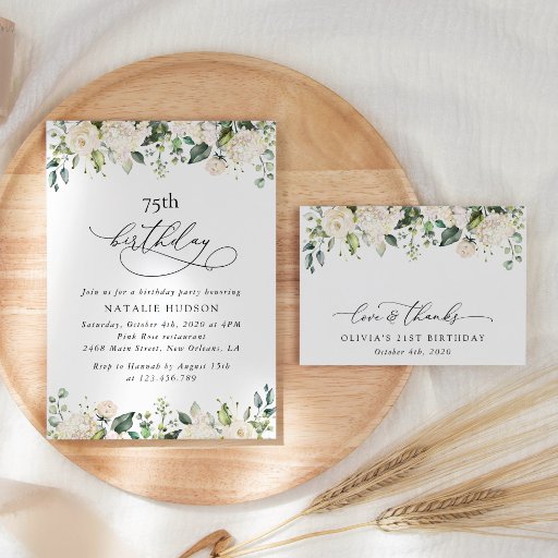 Add a personal touch to your birthday celebration with these stylish and memorable party items! Design features white watercolor flowers and greenery on white background.