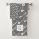 White small flowers on gray floral bath towel set. It showcases a pattern of small flowers and leaves and your monogram on gray background.