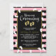 Cute naming ceremony invitation for twin girls with footprints in white and gold scattered over a black and pink striped background. Naming ceremony is written in a charming script. Add your twins' names and the details of the naming ceremony.