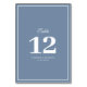 white frame design with dusty blue blackground wedding table number.